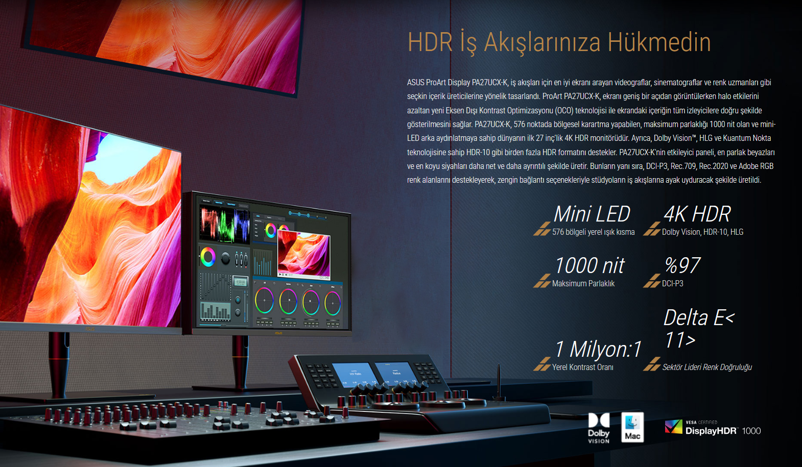 ASUS ProArt PA27UCX-K, içerik üreticilerinin gereksinimlerine uygun birden fazla HDR biçimine ve PQ eğrilerine destek veren ASUS Smart HDR Teknolojisine sahip. Dolby Vision HDR, inanılmaz parlaklık, kontrast ve renk ile içerik üreticilerinin sunum olanaklarını genişleten canlı görseller sayesinde izleme deneyimlerini evrimleştirir. Milyarlarca renk üretebilen sinema düzeyindeki HDR teknolojisiyle olağanüstü görsel kalite ortaya koyar. HDR-10 desteği ile mevcut video yayın servisleri ve sayısı giderek artan HDR özellikli oyunlara uyum sağlanır. Bunlar arasında içerik üreticilerinin ihtiyaçlarına cevap veren PQ Hard Clip, PQ Optimized ve PQ Basic gibi eğriler de bulunur. PA27UCX-K'nin HLG (hibrit log gama) ön ayarı, kullanıcıların BBC iPlayer, Japon NHK TV ve DirecTV gibi yayın ve uydu TV platformları için içerik oluşturmasının yanı sıra bu platformların keyfini çıkarmasına da olanak tanır.