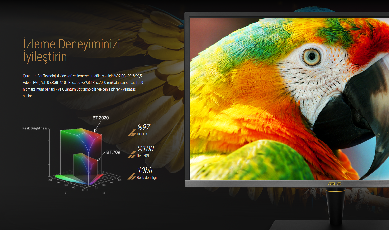 Quantum-dot teknolojisi, %97 DCI-P3, %99,5 Adobe RGB, %100 sRGB ve %83 Rec.2020 renk uzayı ile olağanüstü renk doğruluğu sağlar