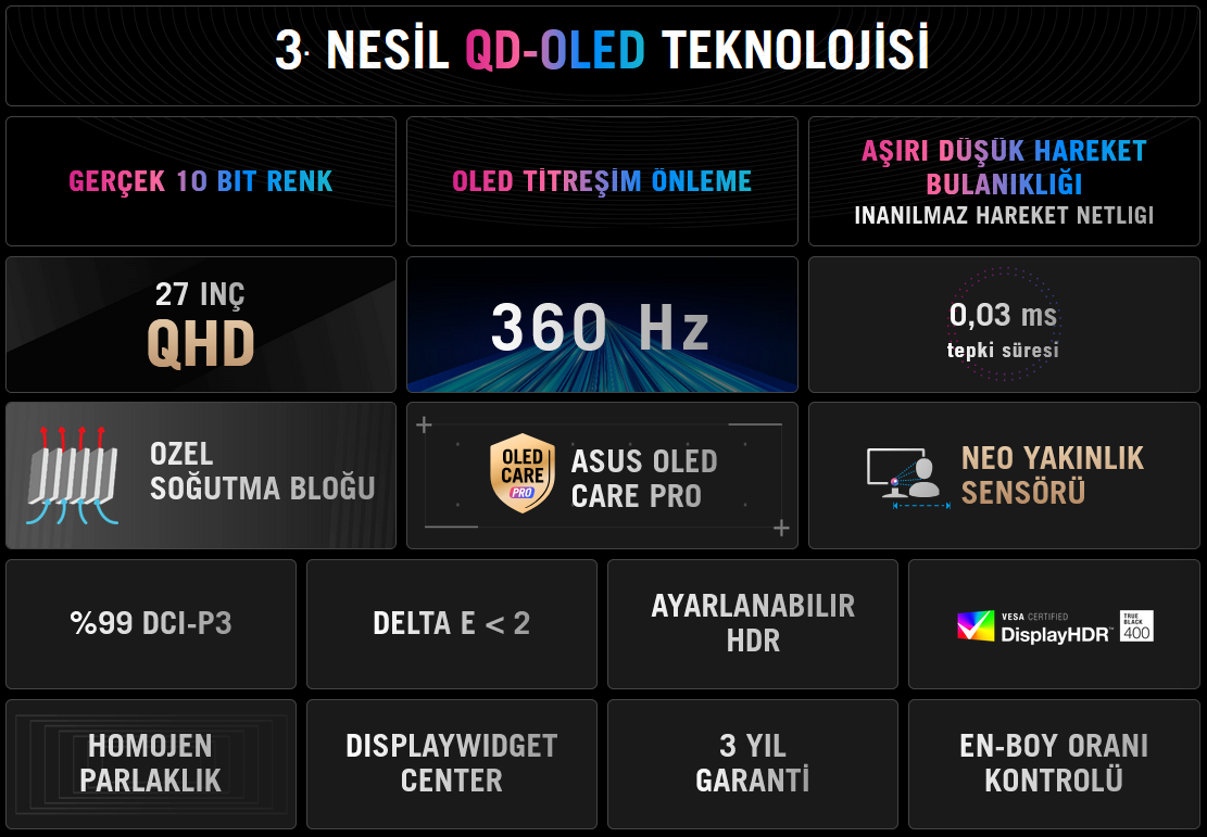 ROG Strix OLED XG27AQDNG, 27 inç 360Hz QHD oyuncu monitörü. Son teknoloji QD-OLED panel, önceki OLED teknolojilerine kıyasla daha uzun kullanım ömrüne sahiptir ve kare hızları dalgalansa bile oldukça düşük bir titreşim ortaya koyar. Neo Yakınlık Sensörü barındıran yeni ROG OLED Care Pro yazılım paketi ile kullanıcı ekran başında olmadığında ekran karartılarak görüntü yanması riskine karşı koruma sağlanır.