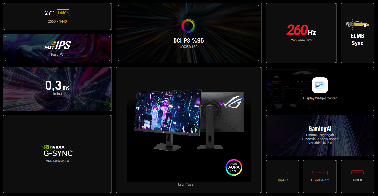 ROG Strix XG27ACMEG Oyuncu Monitörü – 27 inç 2560x1440, 260Hz OC (144Hz üzeri),0,3ms (min),Fast IPS, Aşırı Düşük Hareket Bulanıklığı Senkronizasyonu, USB Type-C, G-Sync uyumluluğu, DisplayWidget Center, tripot soketi, HDR ve Aura Sync