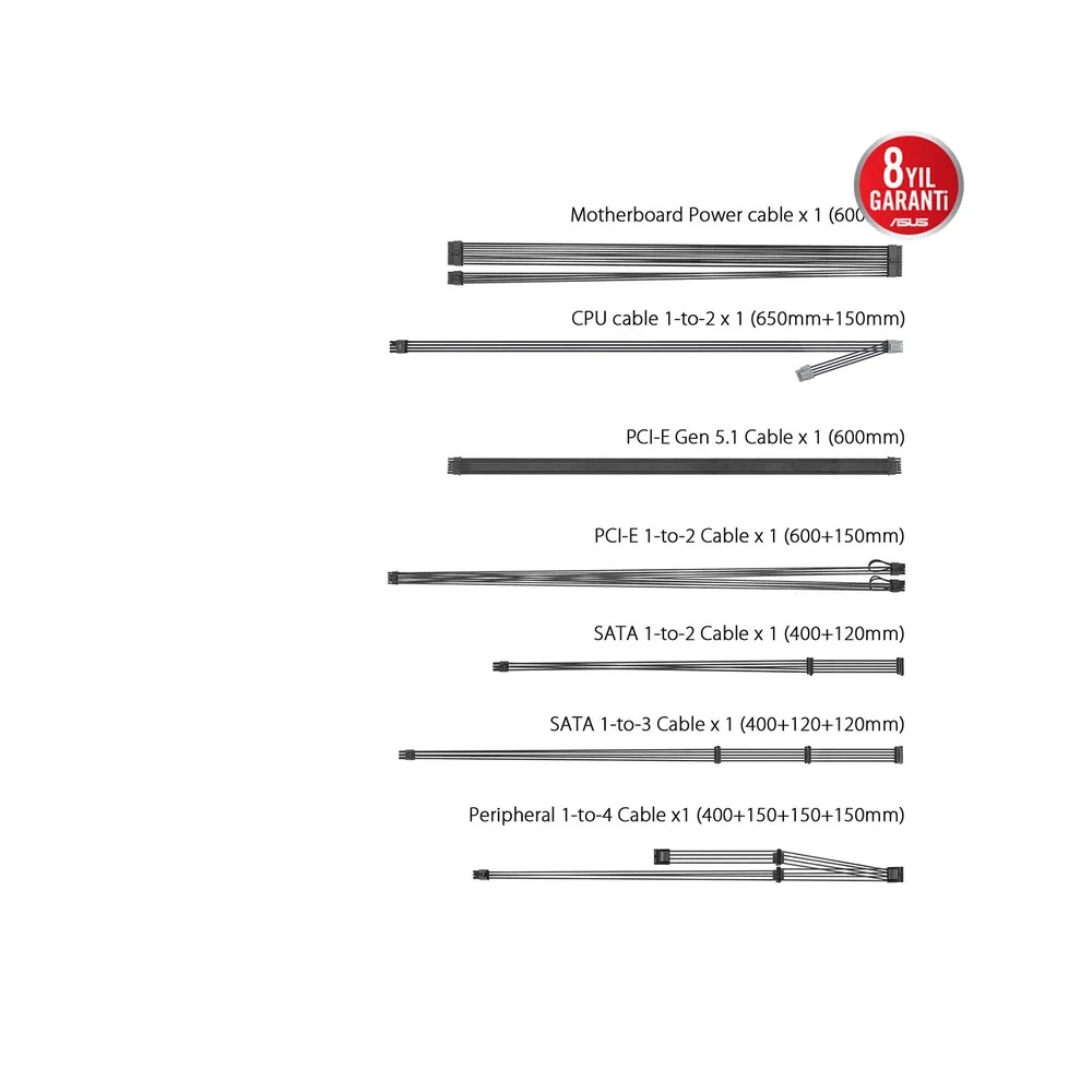 PCIe Gen 5.1 ekran kartlarıyla uyumlu olan 16 pimli PCIe kablosu PSU’nun paket içeriğiyle birlikte gelir.