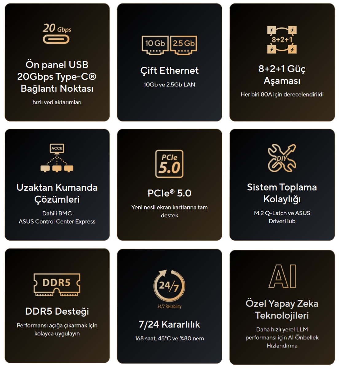 - Ultra Hızlı Bağlantılar: İki adet PCIe 5.0/4.0 x16 yuvası (bir tanesi x4), 10 Gb & 2.5 Gb LAN bağlantı noktası, iki adet PCIe 5.0 x4 M.2 yuvası, panel USB 20Gbps Type-C ve MCIO NVMe desteği.