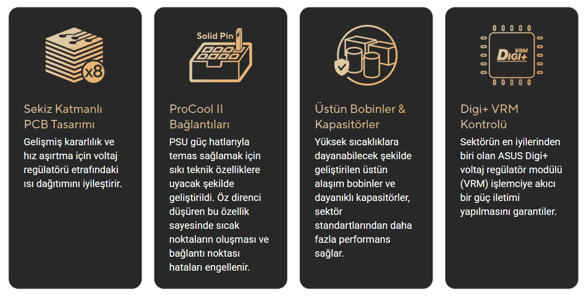 Yüksek çekirdek sayısına sahip işlemcilere uygun olarak tasarlanan Pro WS B850M-ACE SE alçak ve yüksek taraf MOSFET’leri ve sürücüleri 80A için derecelendirilmiş paketlerde birleştiren 8(80A)+2(80A)+1(80A) güç aşaması barındırır. Bu yapılandırma, AMD işlemciler için uygun güç dağıtımı, verimlilik ve kararlılık sağlar.