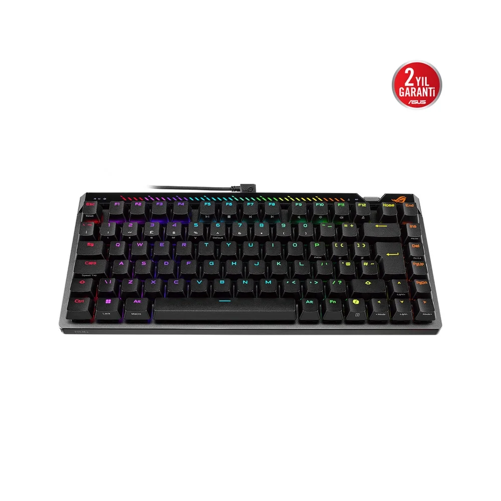 ROG Falchion Ace 75 HE oyuncu klavyesi, hızlıca değiştirilebilen ROG HFX V2 ve V2X manyetik anahtarlar, ROG Hall Sensörü, Rapid Trigger düğmesi, hassasiyet ayar tekerleği, interaktif dokunmatik panel, 8000 Hz sorgu oranı, altı katmanlı sönümleyici, üç farklı eğim açısı, dayanıklı ROG doubleshot PBT tuş başlıkları ve koruyucu taşıma çantası