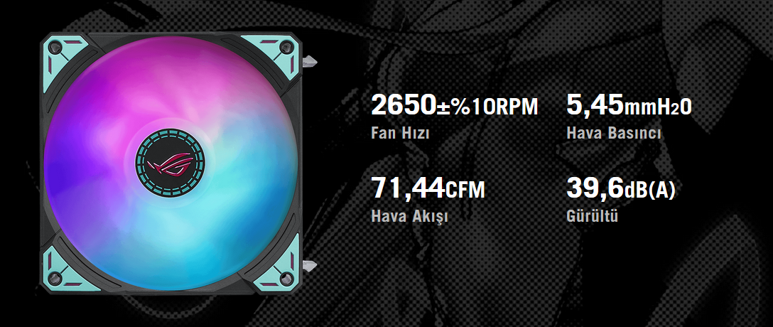 ROG RYUO IV MF-12C ARGB Fan, düzenli bir görünüm sunmanın yanı sıra kararlı ve güçlü hava akışı sağlayarak sisteminizin soğutma kapasitesini geliştirir. Önceden monteli birleşik ARGB fanlar sayesinde basitleştirilen kurulum süreci ile uygun performans korunurken sorunsuz bir kurulum sağlanır.