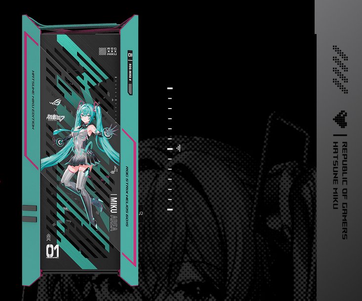 - İşbirliği sürümü: Yenilmez ROG performansını ve imza niteliğindeki mavi-yeşil ve pembe Hatsune Miku renk temasına sahip bilim kurgu odaklı estetiği bir araya getirir.