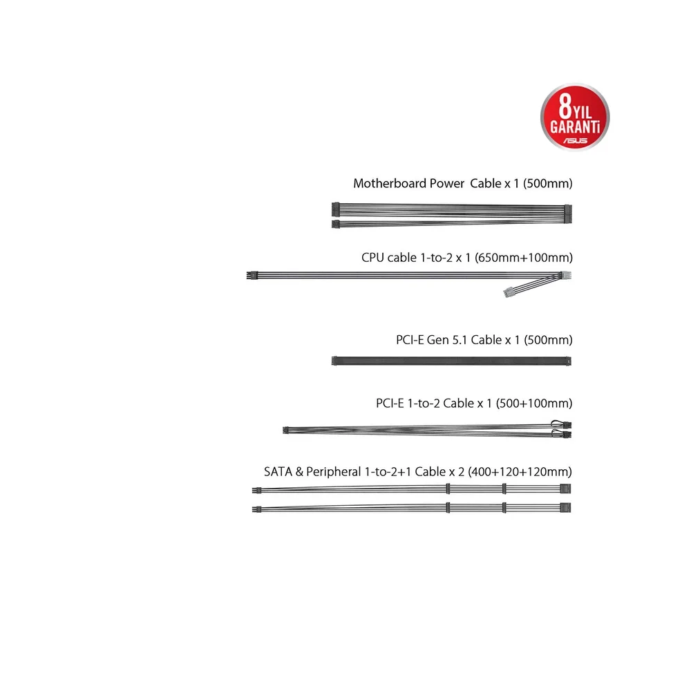 - ATX 3.1 Uyumluluğu: TUF Gaming Gold EVO Serisi, ATX 3.1 yönergeleriyle uyumludur ve PCIe Gen 5.1 ekran kartlarıyla uyumluluk için 16 pimli PCI® kablo ile birlikte gelir.