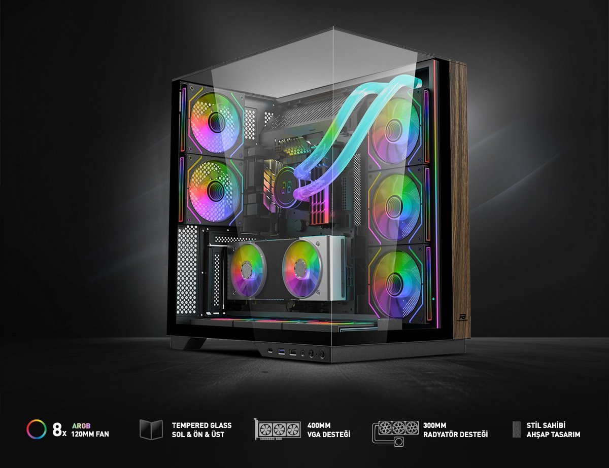 PowerBoost JBST-PBA100B 8x 12cm ARGB Fanlı Triple Temperli Cam Akvaryum Cam Mid Tower Gaming ATX Kasa