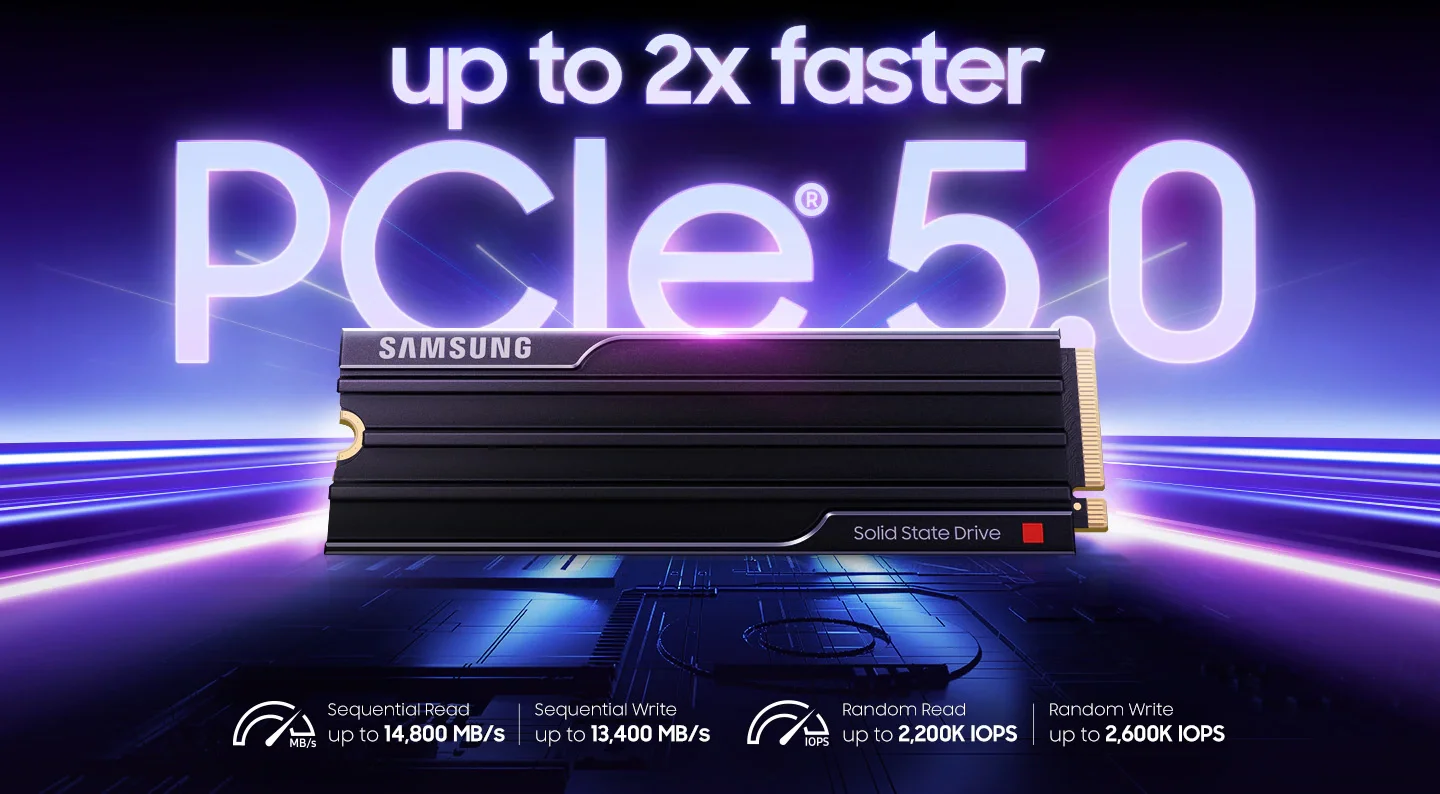PCIe® 5.0 performansını en üst seviyeye taşıyın. 9100 PRO, 14.800/13.400 MB/sn’ye kadar yıldırım hızında ardışık okuma/yazma hızlarına ulaşır ve 990 PRO’dan iki kat daha hızlıdır. Sadece 5. Nesil ile mümkün olan 2.200K/2.600K IOPS’ye kadar rastgele okuma/yazma hızlarıyla 4. Nesil sınırlarını geride bırakın.